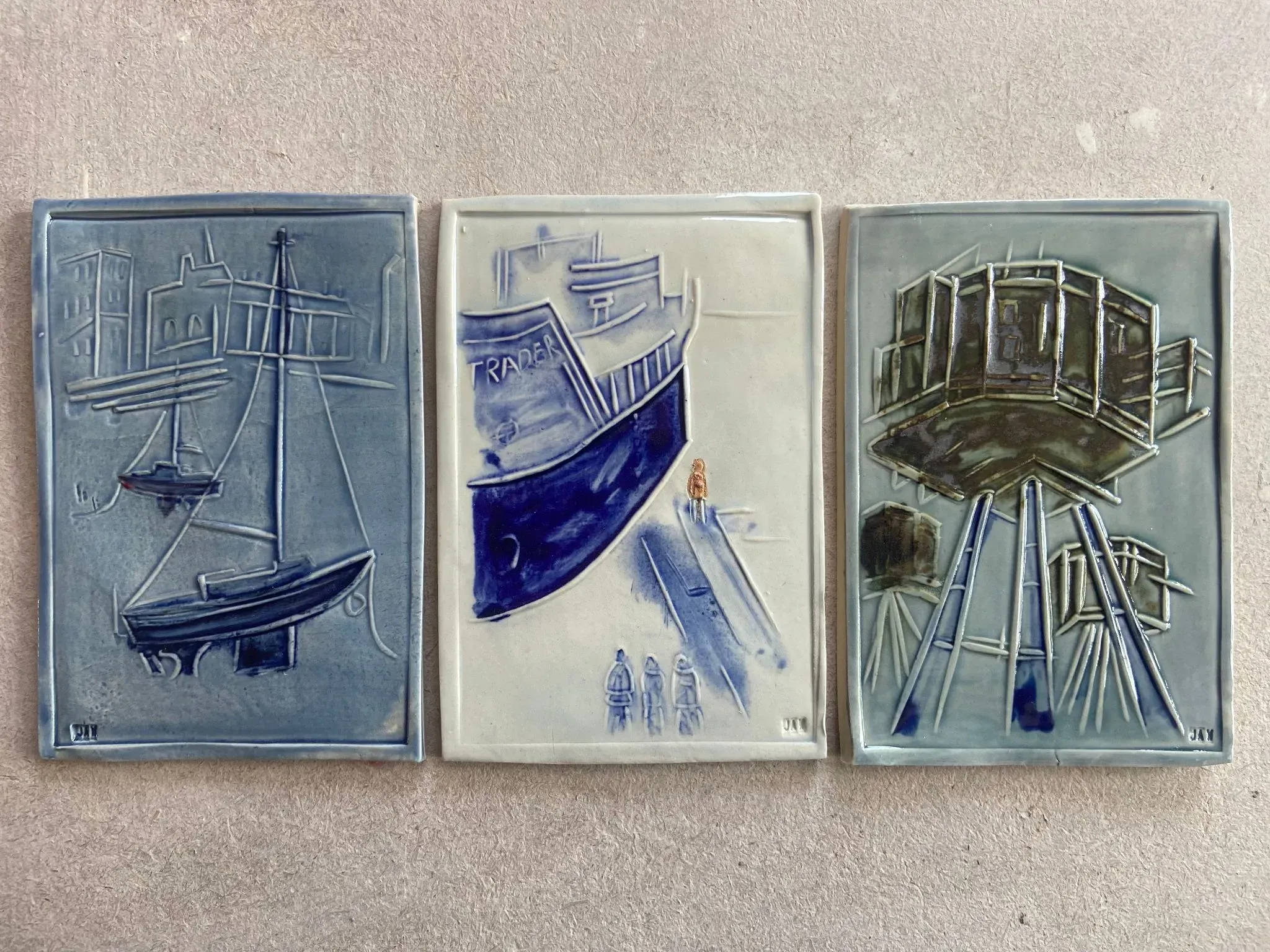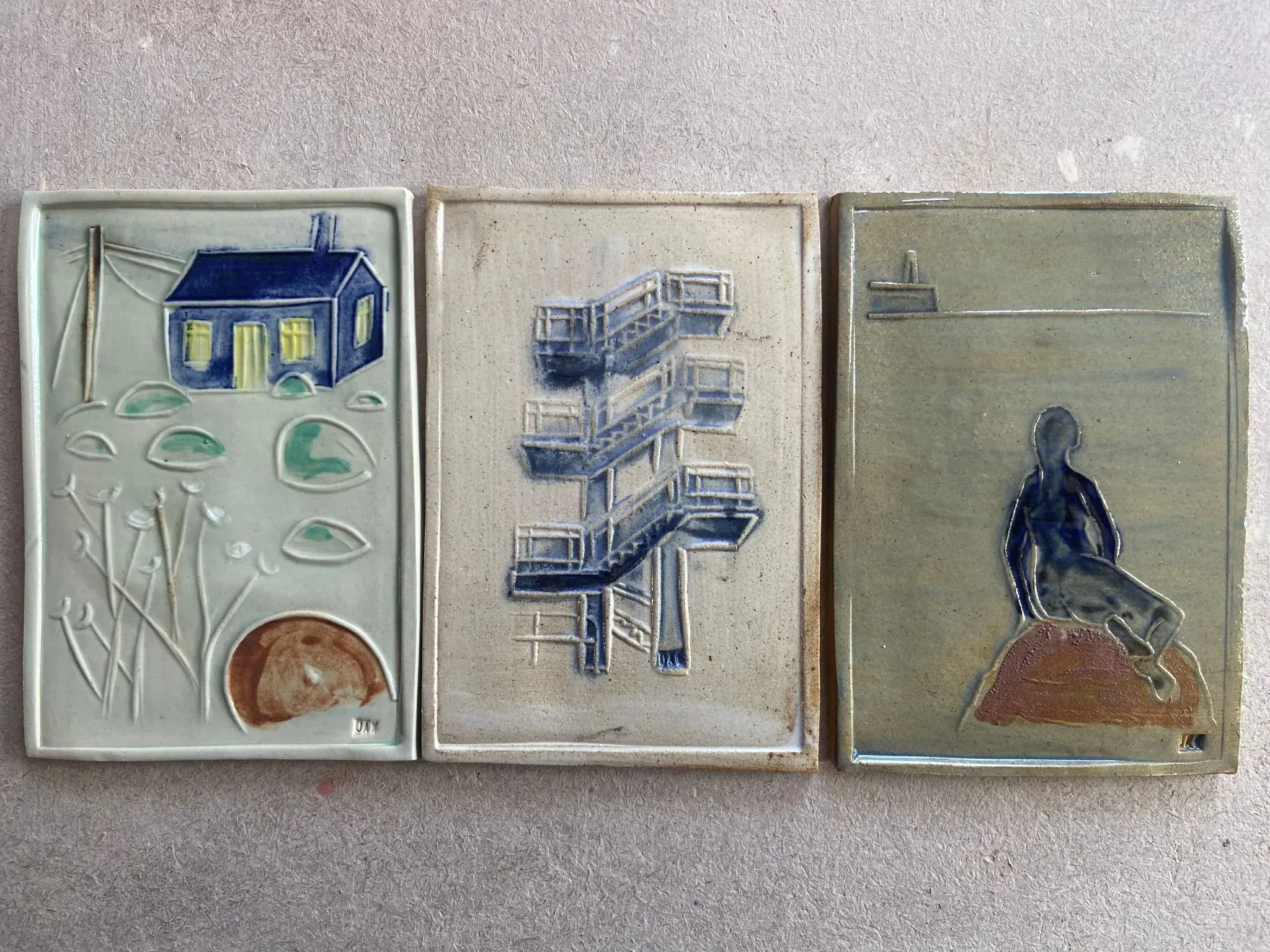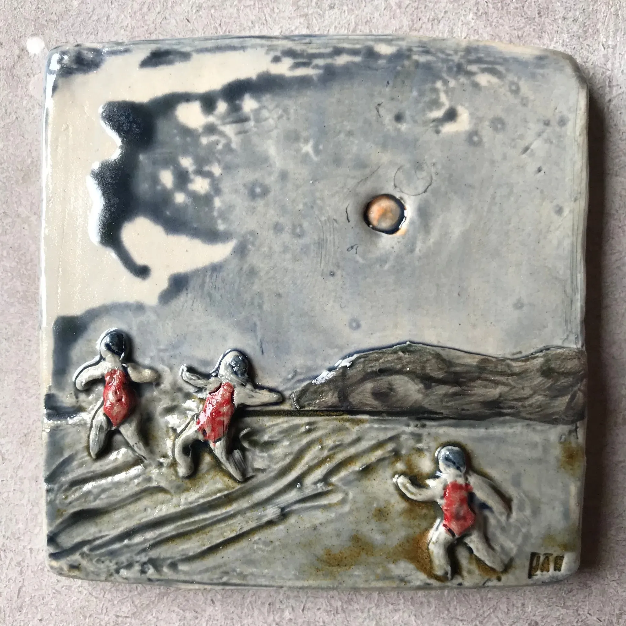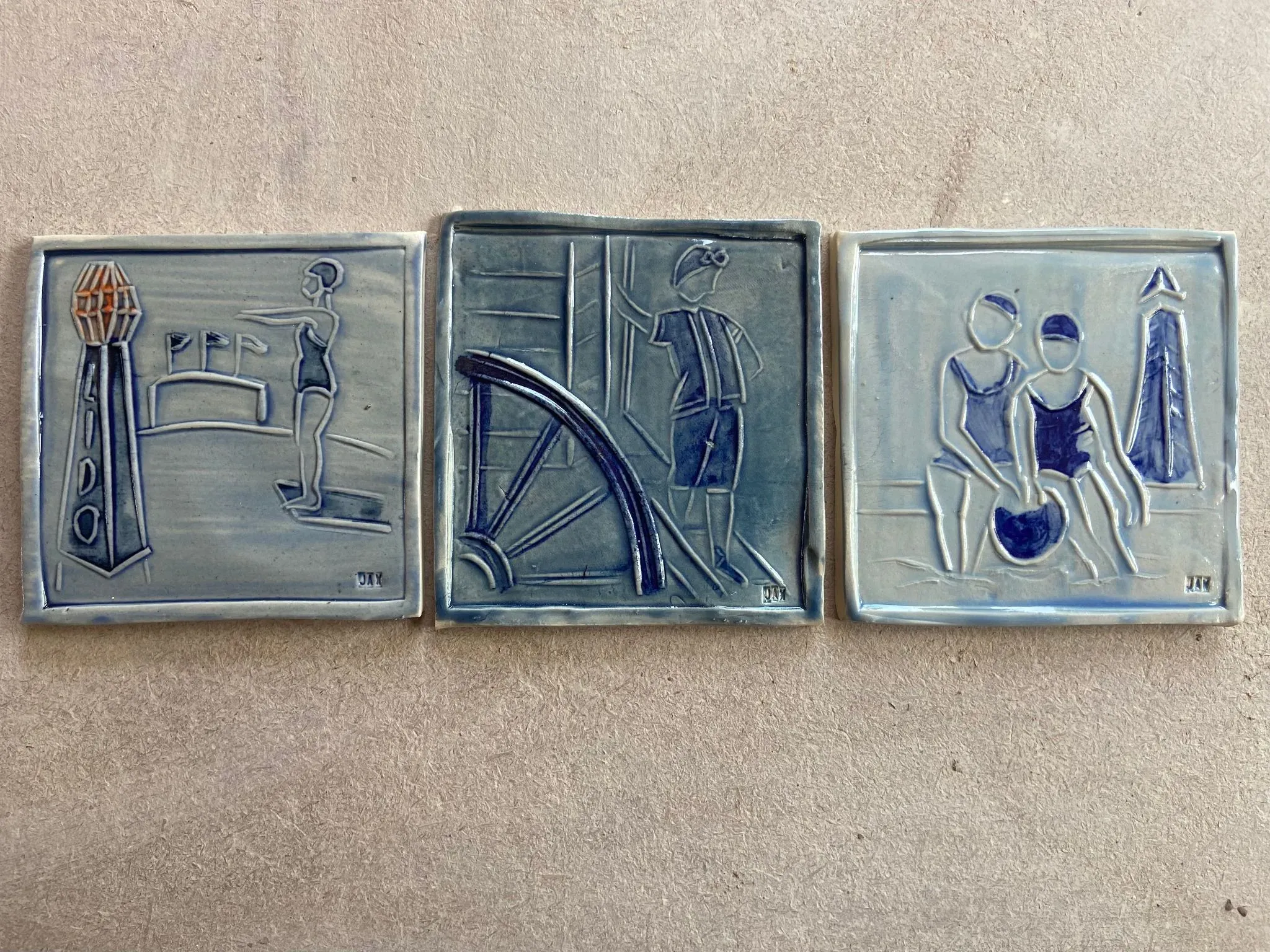 Jayne enjoys taking on ambitious projects which have significant community involvement. In 2022 she created the Mermaid Army a collection of ceramic sculptures of open water swimmers. Jayne made her popular linocut hand made tiles using her sketches of the swimmers.