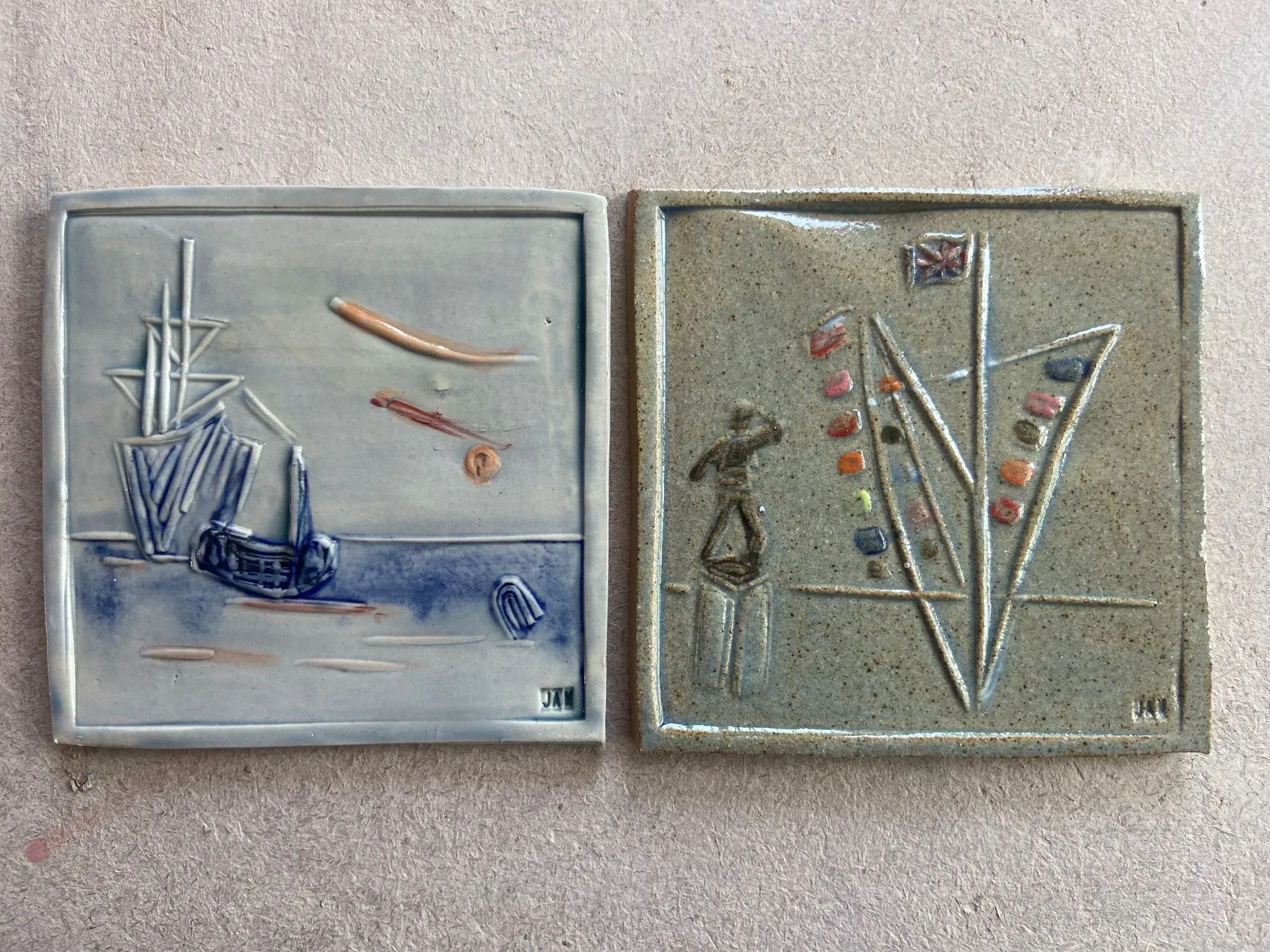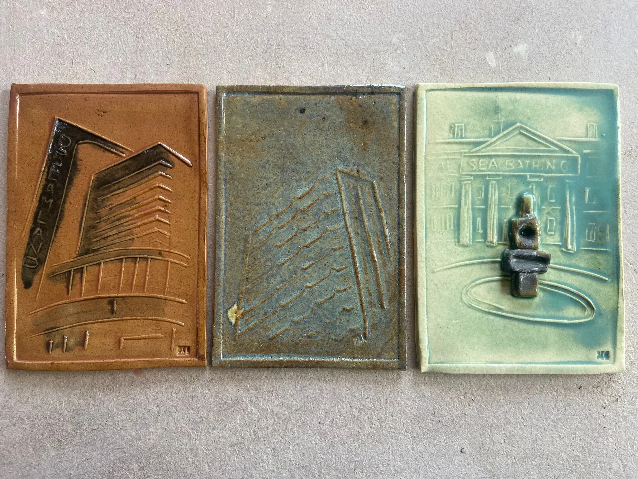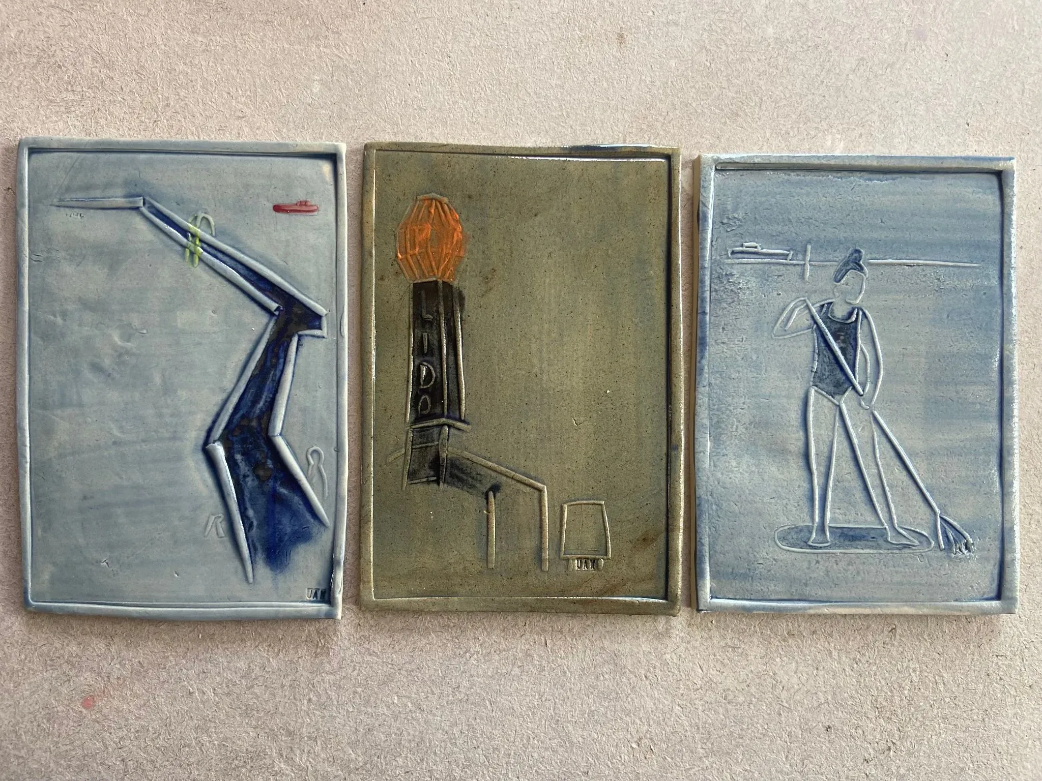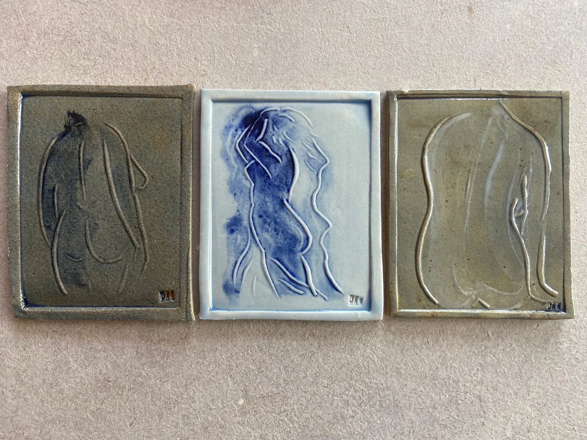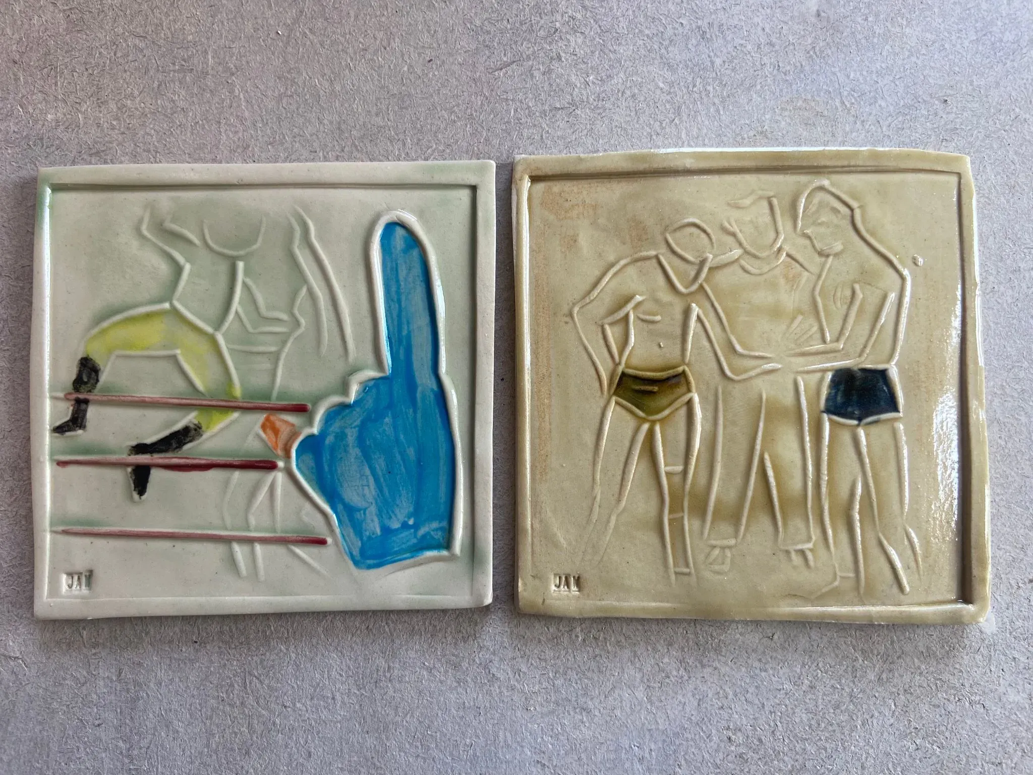 Jayne enjoys taking on ambitious projects which have significant community involvement. In 2022 she created the Mermaid Army a collection of ceramic sculptures of open water swimmers. Jayne made her popular linocut hand made tiles using her sketches of the swimmers.