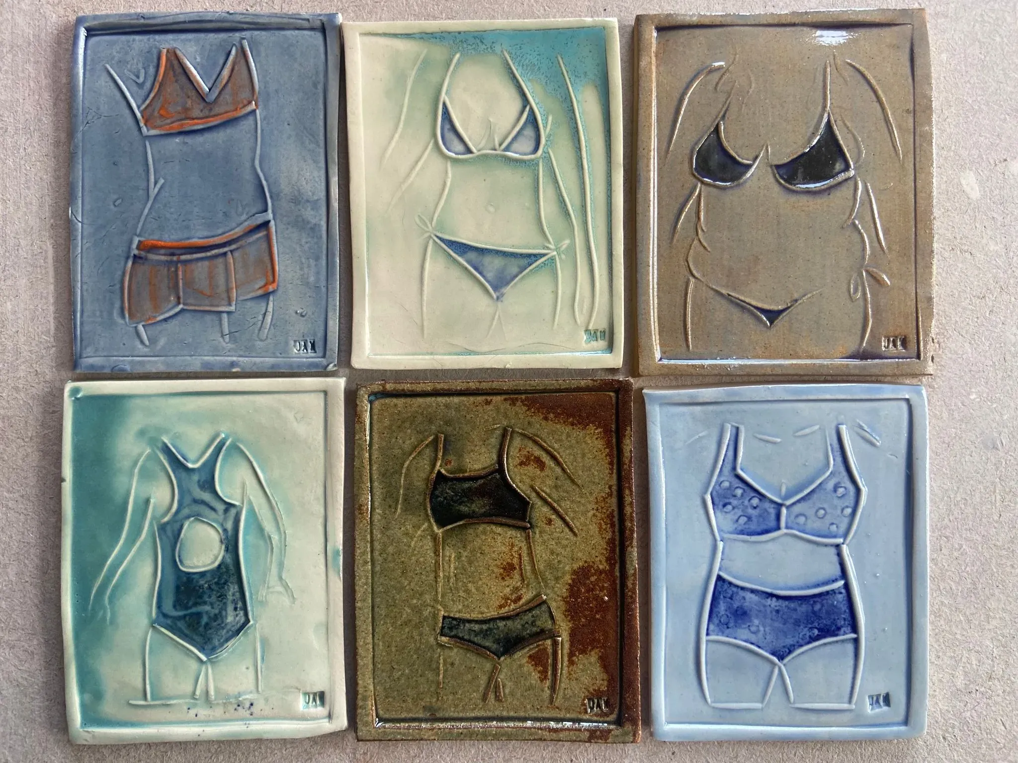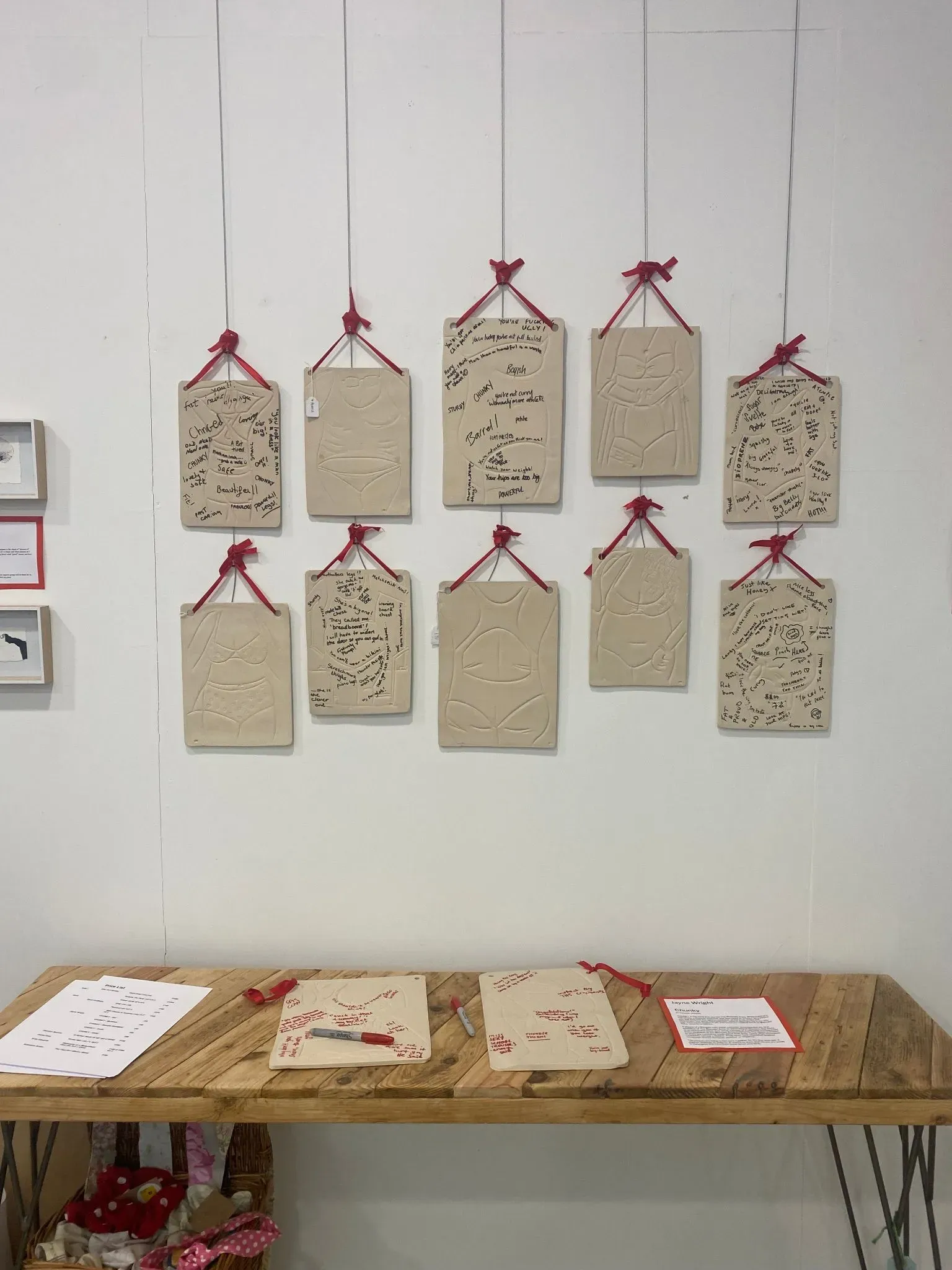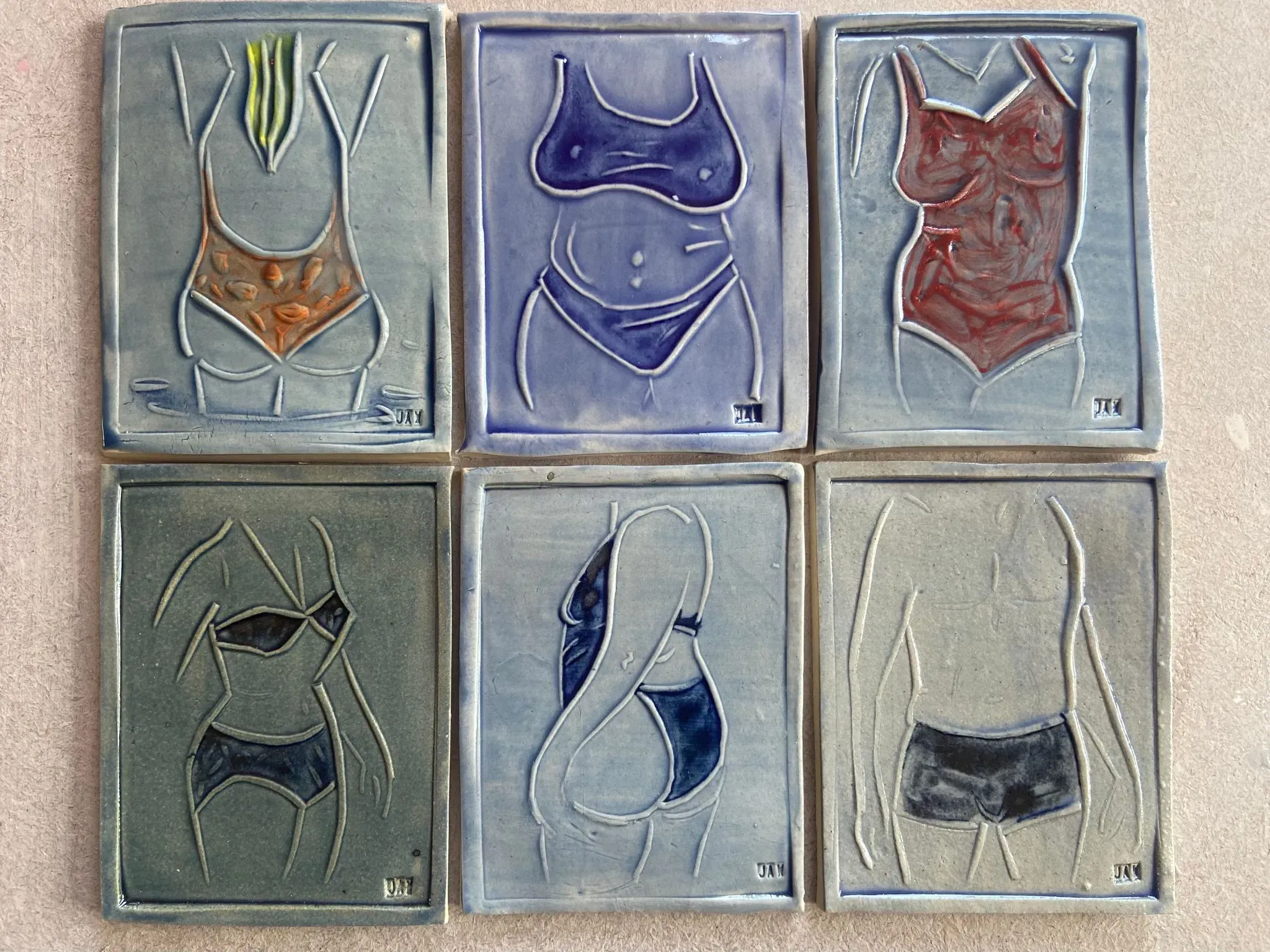 Using the drawings and studies of the Mermaid Army swimmers, Jayne Wright created the interactive ceramic plaques to be exhibited alongside the sculptures. People were invited to write comments that may have been made about their bodies on the plaques. The plaques are currently touring with Words Matter, This Ends Now.