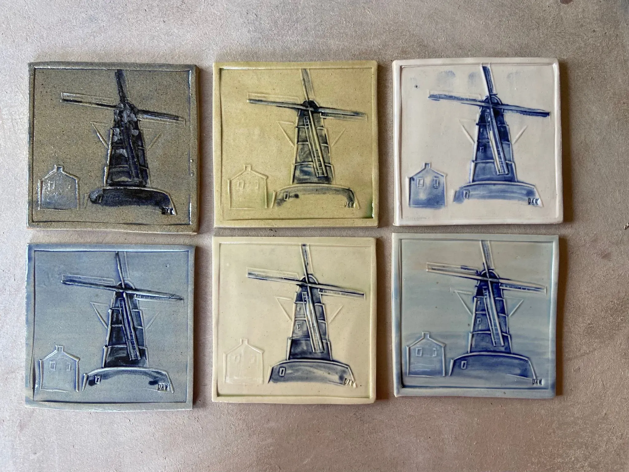 Each stoneware tile is uniquely made using a clay printing process using linocuts and then hand painted with oxides and underglazes, the glazed using a once-fired technique.