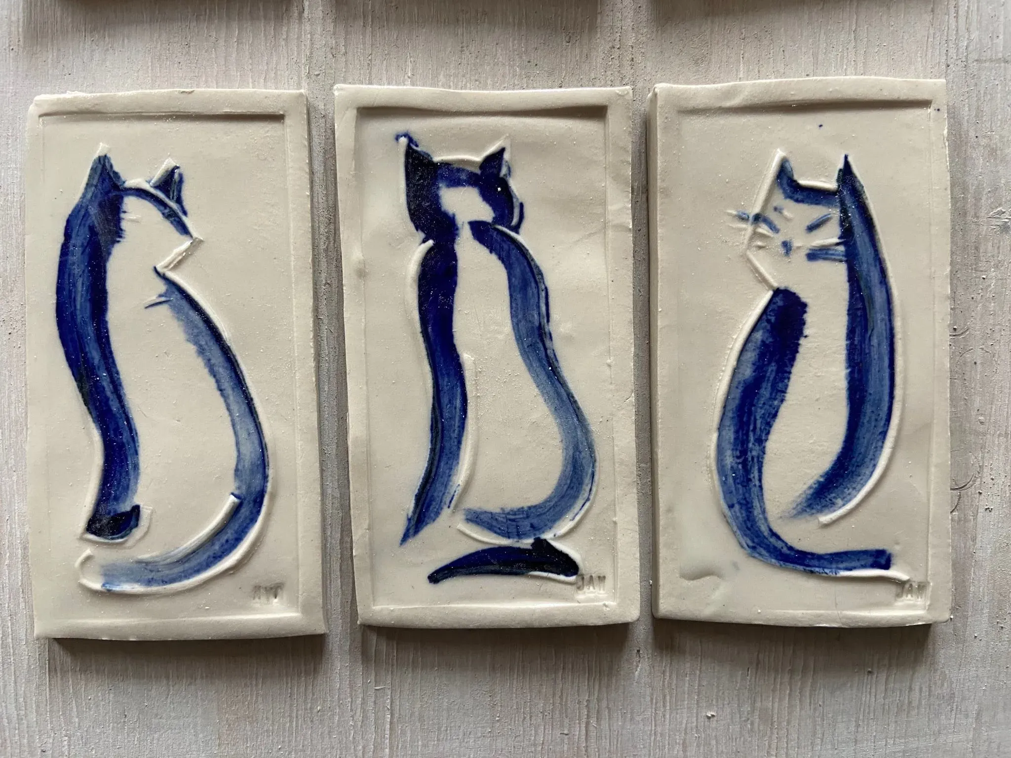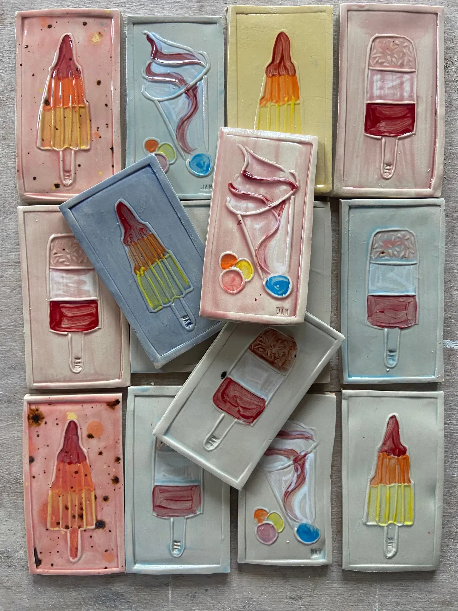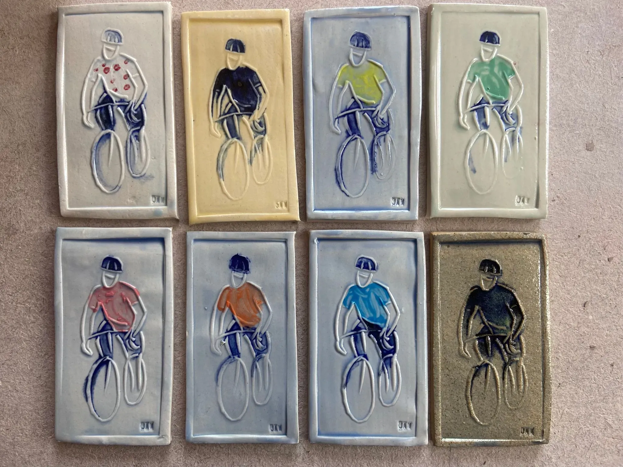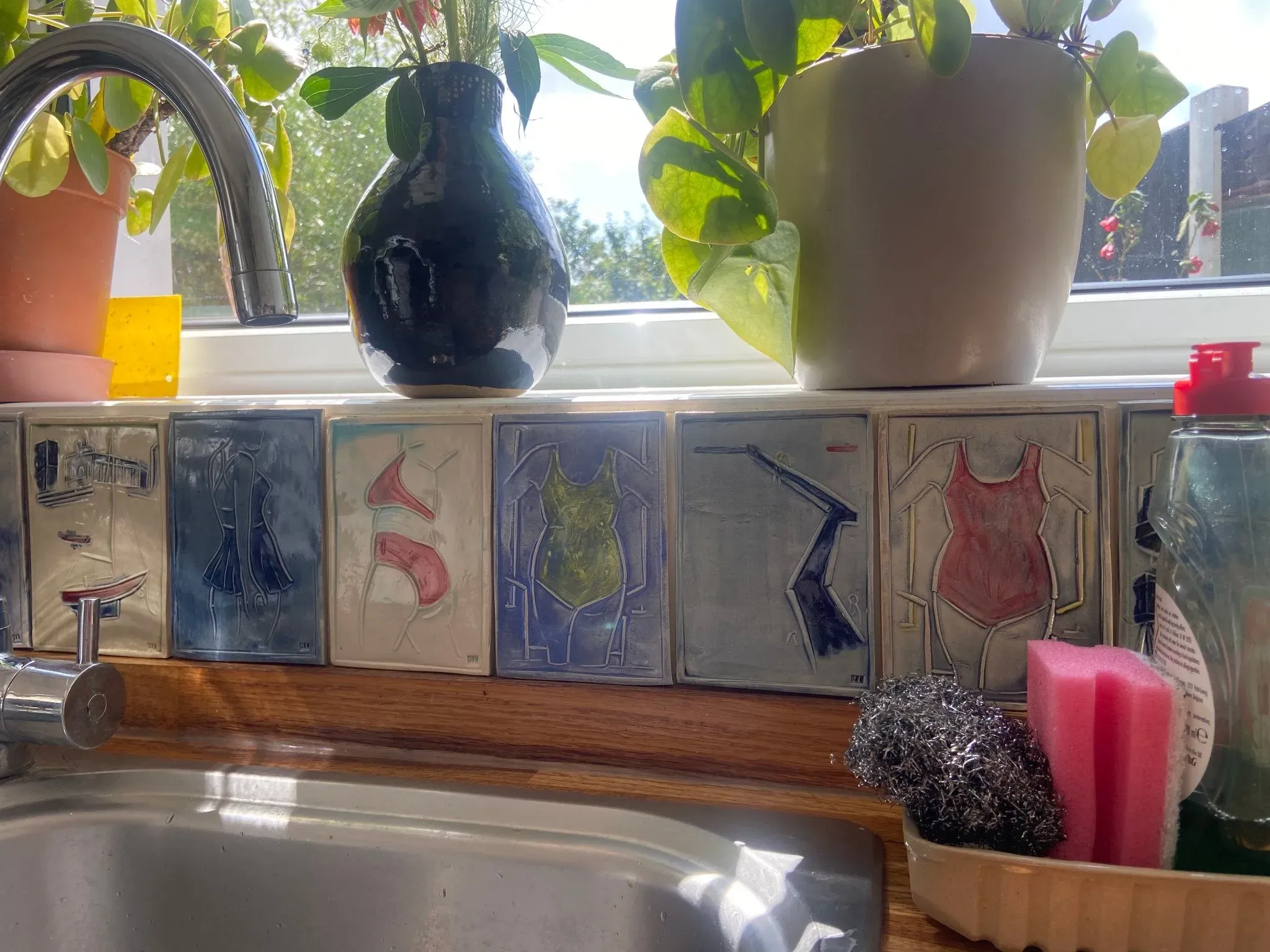 The tiles began as an accompaniment to the Mermaid Army, using the drawings and studies of the swimmers. The tiles then documented where people swim and iconic landmarks. The collection of 125 tile designs now includes cyclists, cats, dogs, wrestlers, pole dancers, iconic ice creams, flowers, horoscopes and turner paintings.